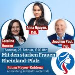 Am Freitag, 8. März, 19.00 Uhr, Koblenz-Karthause JuBüZ, Potsdamerstraße 4, 56075 Koblenz – mit Joachim Paul (MdL) und zwei Gästen: Nicole Höchst (MdB) und Markus Frohnmeier